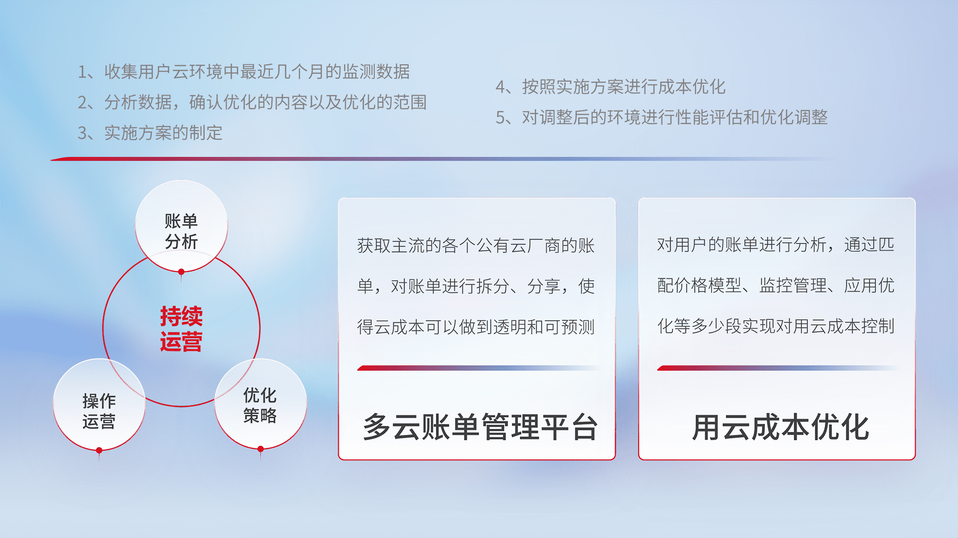通过多云纳管,,,,以统一的资源数据模型把客户的云资源进行抽象和封装,,进而实现对多云资源的统一操作,,,保障云资源管理的可靠性、、稳定性与可用性。。量身定制化运维内容,,,配置、、开发运维、、、补丁管理、、备份、、、监控、、认证和访问管理、、审计和日常巡检等,,,保障在用云过程中的可靠度,,稳定度以及高可用率。。。